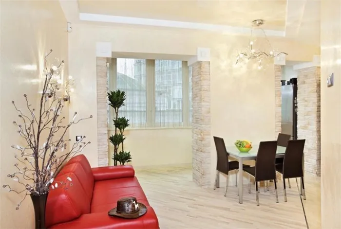 При объединении балкона с кухней или гостиной следует полностью убрать дверные и оконные блоки. Для их разделения используются занавески или ширмы.